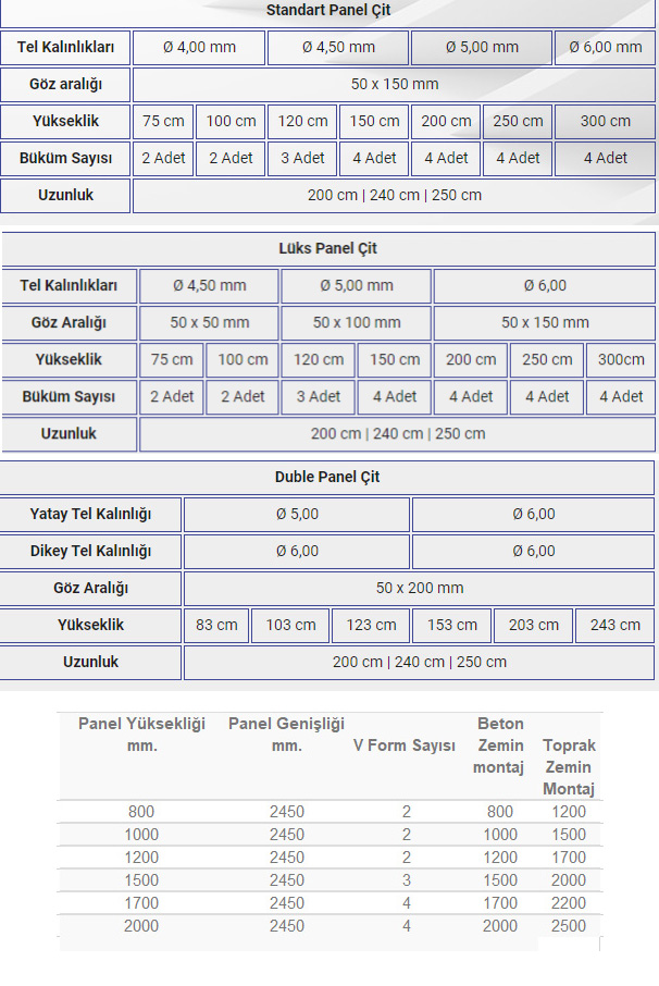 Panel çit hasırları 5/15 cm.göz aralıklı, 250 cm. boyunda ve muhtelif yüksekliklerde imal edilmektedir.