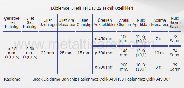Düz hat jiletli telinde yine aynı şekilde hammaddesi galvaniz, 430 kalite paslanmaz, 304 kalite paslanmaz olarak 3 sınıfta imalatı gerçekleştirilir. Yine aynı şekilde 45 cm, 60 cm, ve 90 cm yüksekliği bulunan yerlere montajı yapılır. 0,5 mm incelikte jilet sacına sahip olup keskin uçları bünyesinde barındırır.
