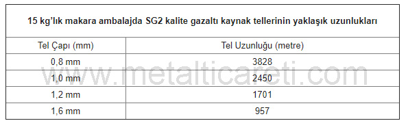 Aşağıdaki tabloda; SG-2 kalite 15 kg’lık bir gazaltı kaynak teli makarası için, 0.80, 1.00, 1.20 ve 1.60 mm tel çapları esas alınarak hazırlamış olduğumuz metre bilgileri yer almaktadır. SG-2 standardındaki gazaltı kaynak telleri düşük karbonlu ve düşük alaşımlı çeliklerden imal edildikleri için hesaplamalarımızda özkütleyi 7,80 gr/cm3 aldık.